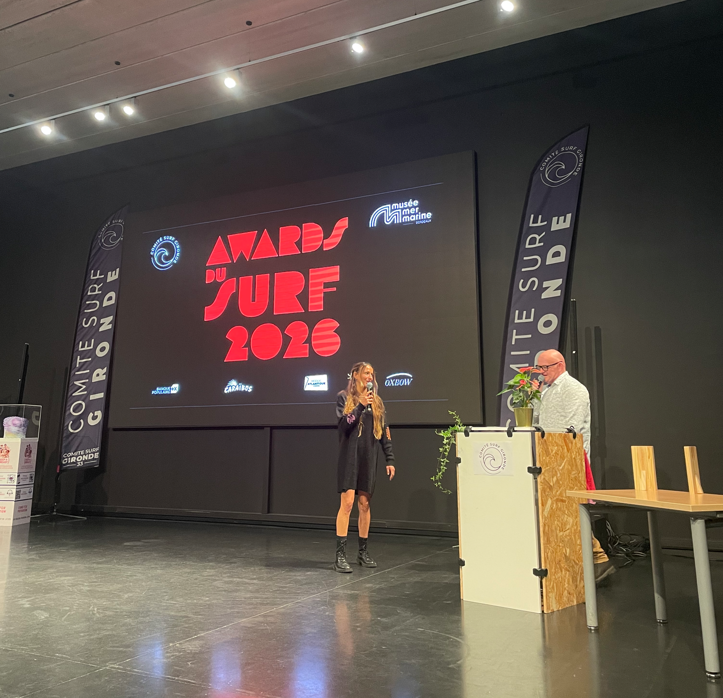 Ce jeudi 26 février avait lieu la première édition des Awards du Surf, organisée par le comité de gironde de surf au musée Mer Marine de Bordeaux. Une soirée inédite et festive pour célébrer les talents et les passionnés de surf qui font briller cette discipline ! 10 Lauréats ont été mis à l’honneur pour leurs performances sportives, leur engagement ou leur contribution à la scène surf locale, nationale et internationale. En tant que partenaire, Caraïbos a pu décerner le prix du choix du Public à une jeune espoir du Bodyboard français, Emie Padois. La cérémonie s’est clôturée avec la diffusion du film « The Rift » de Maud Lecar, marraine de l’évènement. Un film qui retrace son tournant de carrière, à la recherche de sensations fortes avec des images à couper le souffle au cœur de ses sessions de Big Surf.