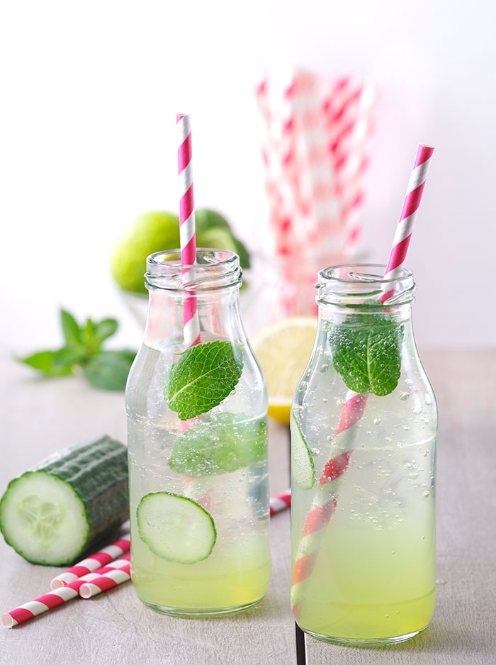Directement dans le verre, placer quelques feuilles de menthe fraiche puis un quartier de citron vert.